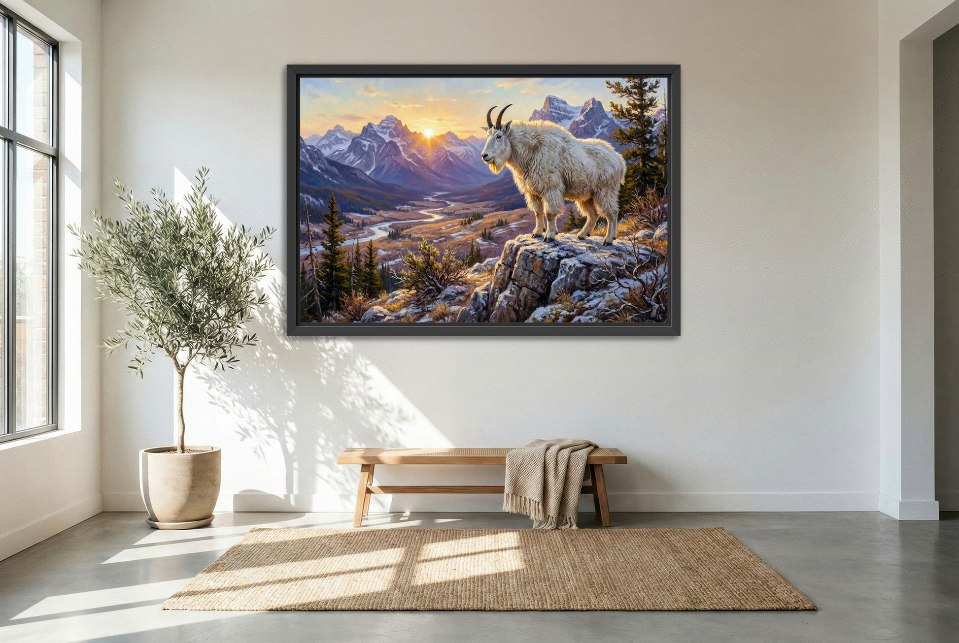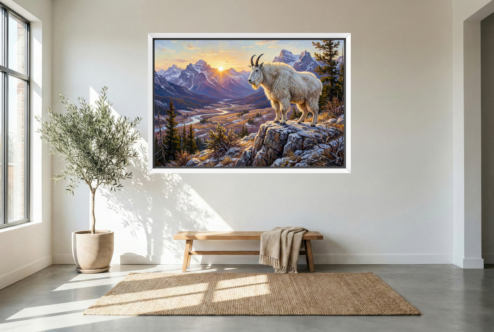 A high-country Rocky Mountain goat stands like a white ghost of the peaks—heavy-chested and sure-footed, with long black horns sweeping back over a shaggy, snow-colored coat. It clings effortlessly to sheer cliffs and wind-scoured ridgelines, thriving where thin air, ice, and stone keep most other animals out.